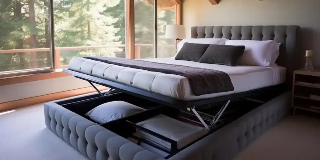 Eenvoudig maar stijlvol tweepersoonsbed in een modern design. Ideaal voor kleine appartementen. Heeft een ingebouwde nis voor linnengoed en een handig hefmechanisme. Verkrijgbaar in populaire kleuren: grijs, beige, grafiet. Houten frame, bekleding – dichte stof, slijtvast.